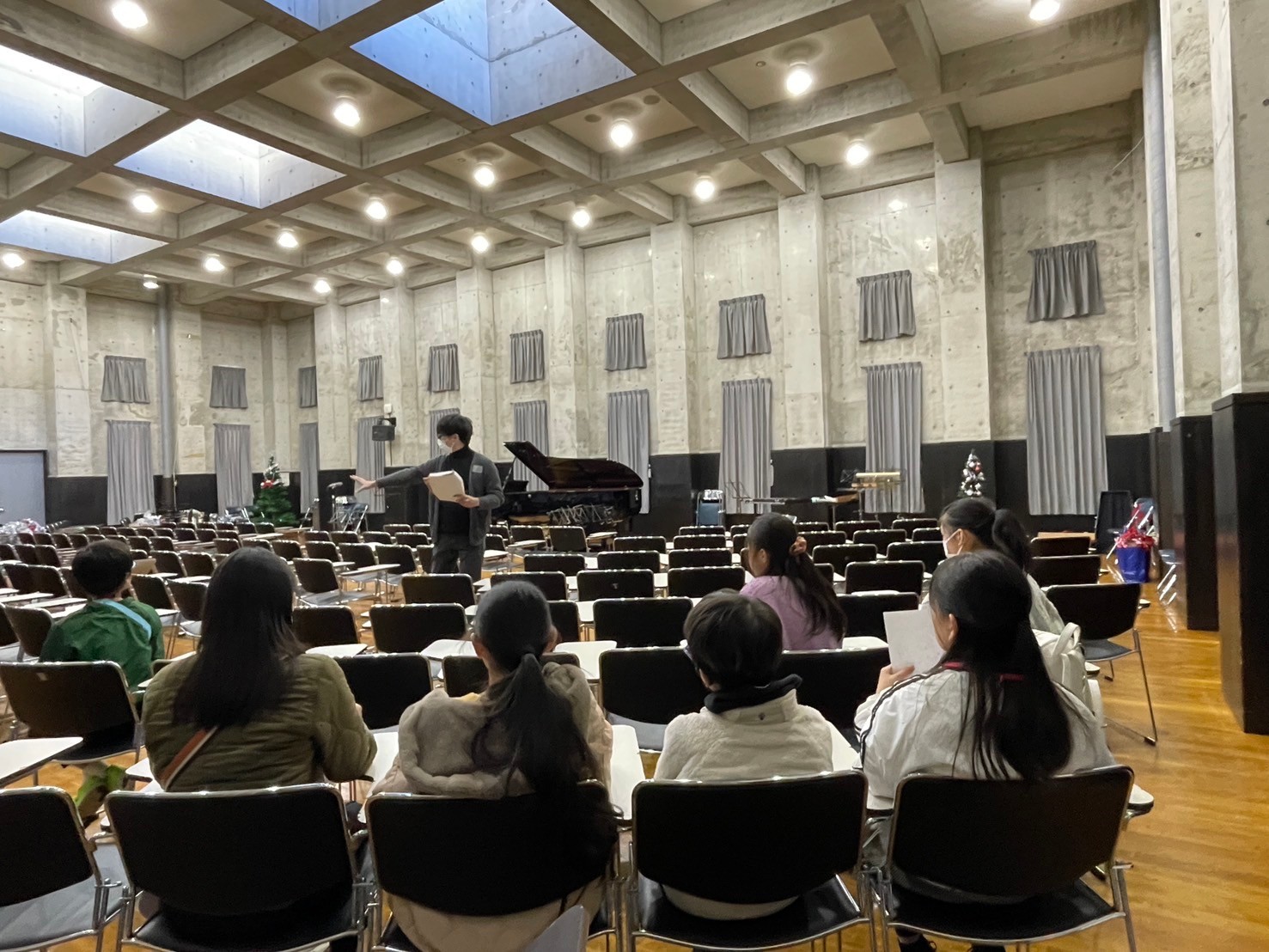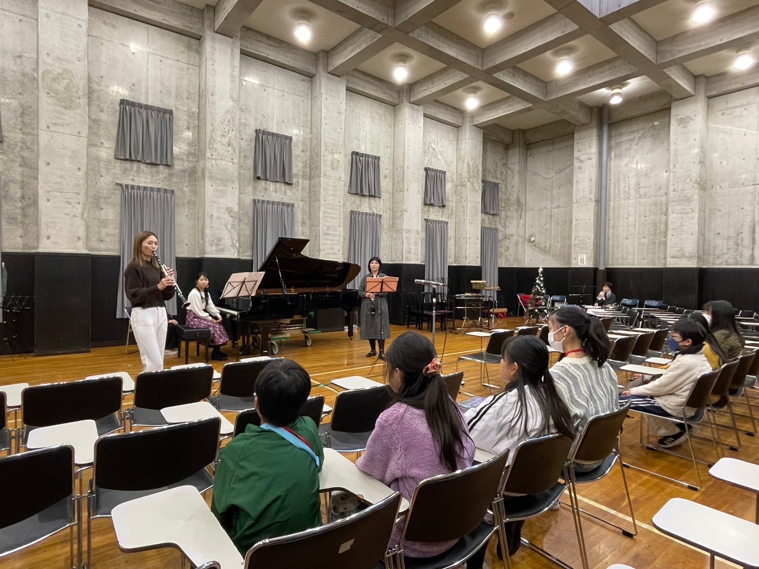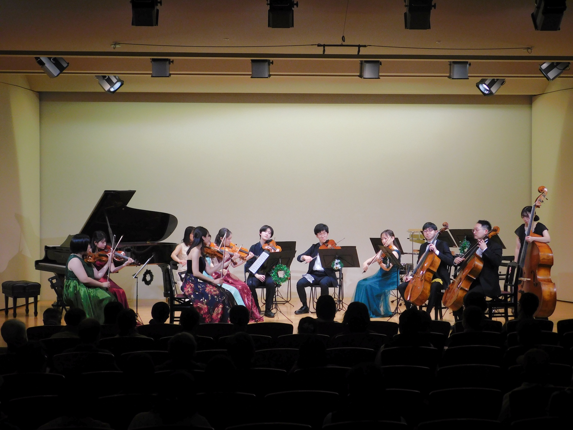 12月21日に「2025MUSE Christmas Concert」を開催しました。 今回はエスカードホールに場所を移しての開催となり、前半は箏の格式高く流麗な響きに始まり、ピアノソロによる華やかなショパンの調べ、珍しいメゾソプラノとヴィオラとピアノによるアンサンブルをお楽しみいただきました。 後半はMUSEアンサンブルの演奏に乗せて、クリスマスの定番曲やマリンバの華麗なテクニックをご堪能いただき、最後は会場の皆様とともにきよしこの夜を合唱し、会場はクリスマスらしい温かい雰囲気に包まれました。