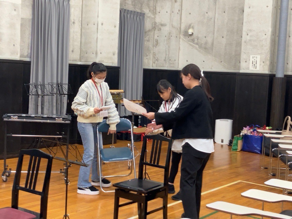 実際に演奏する会場の文化ホール入口にて、響き具合や管楽器の飛沫感染防止シールドの確認、また、文化ホールのステージではアンサンブルの合わせ練習と雨天時の配置確認を行いました。