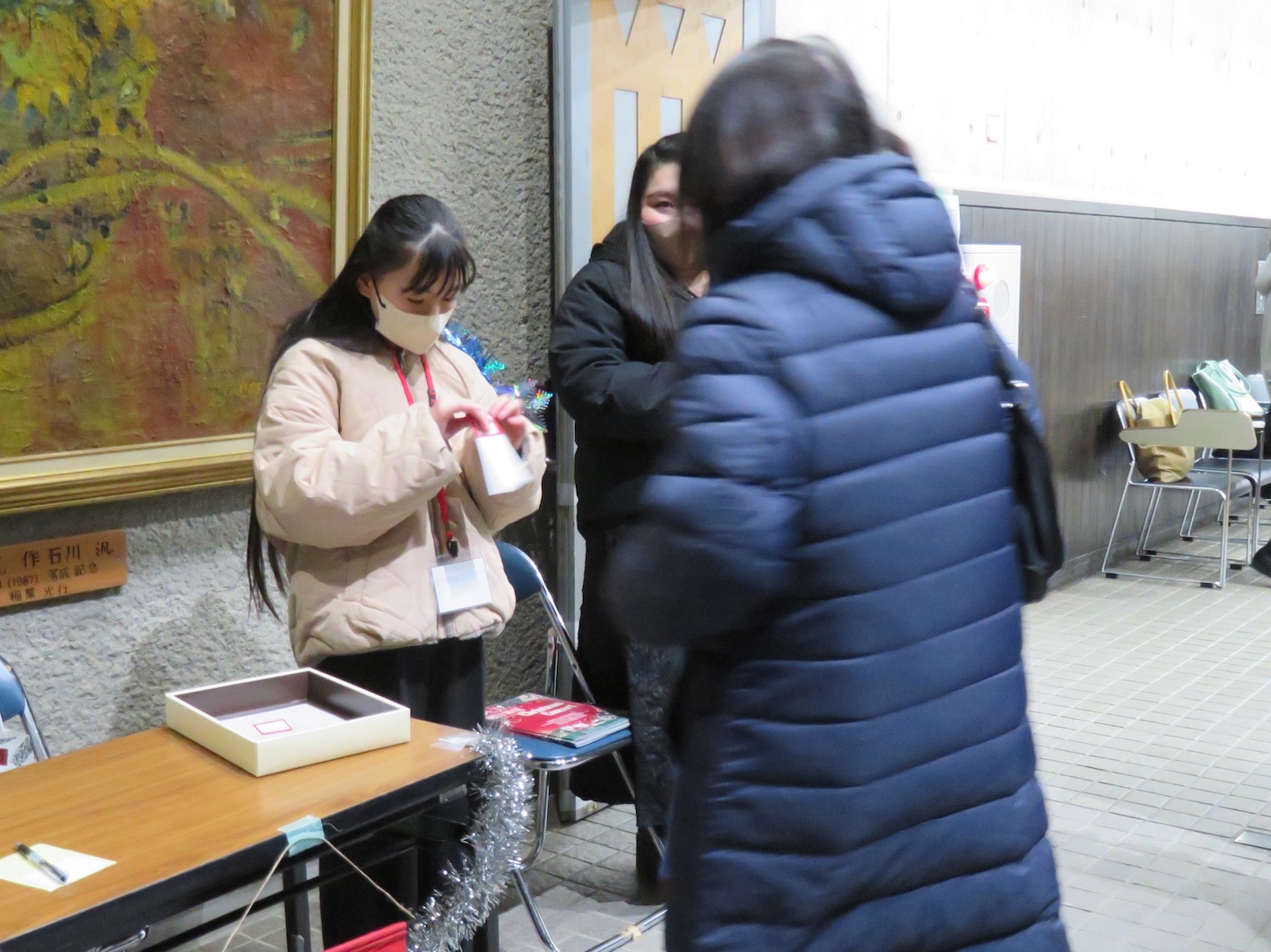 写真:12月20日 中止を残念がるお客さんに対応する会員(会長と副会長)