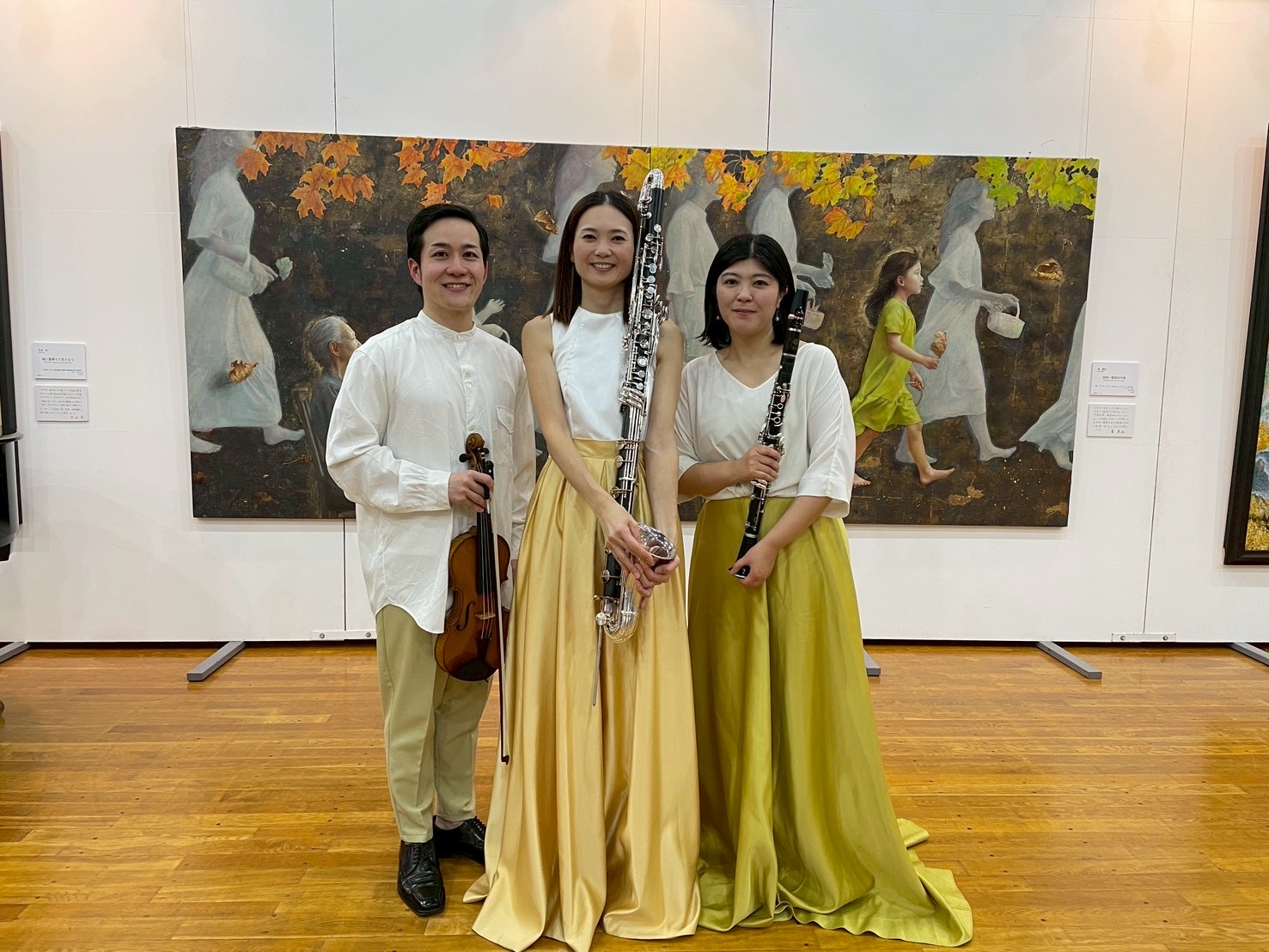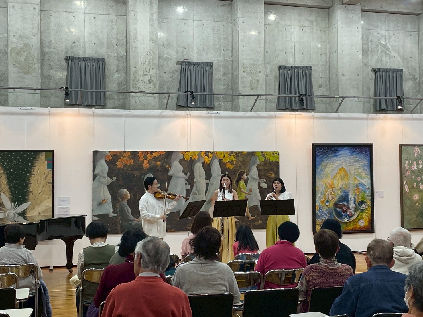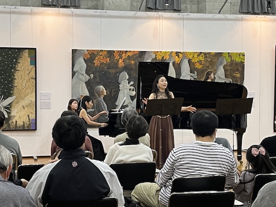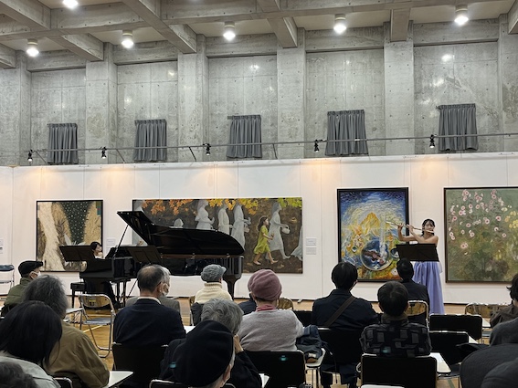 22日にはヴァイオリンとクラリネット、バスクラリネット、23日にはピアノとフルート、ソプラノによるトリオが演奏しました。22日は様々なジャンルの音楽を多彩な響きで演奏し、息の合ったアンサンブルでお客様を魅了しました。23日はあたたかい音色、歌声が会場を包み、曲によって立ち位置を変え、それぞれ曲に合った絵画の前で演奏する演出も行いました。美術と音楽のコラボレーションをお楽しみいただきました。